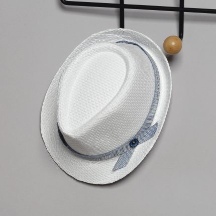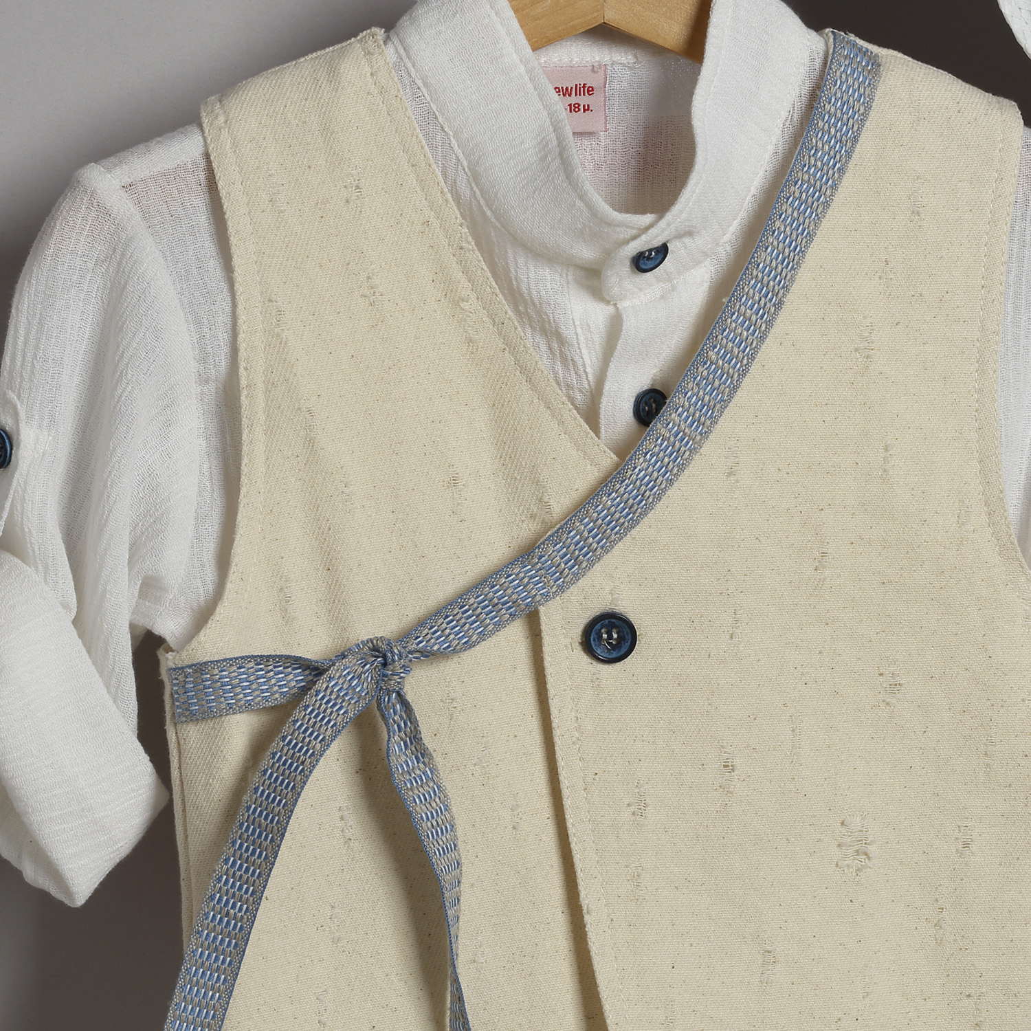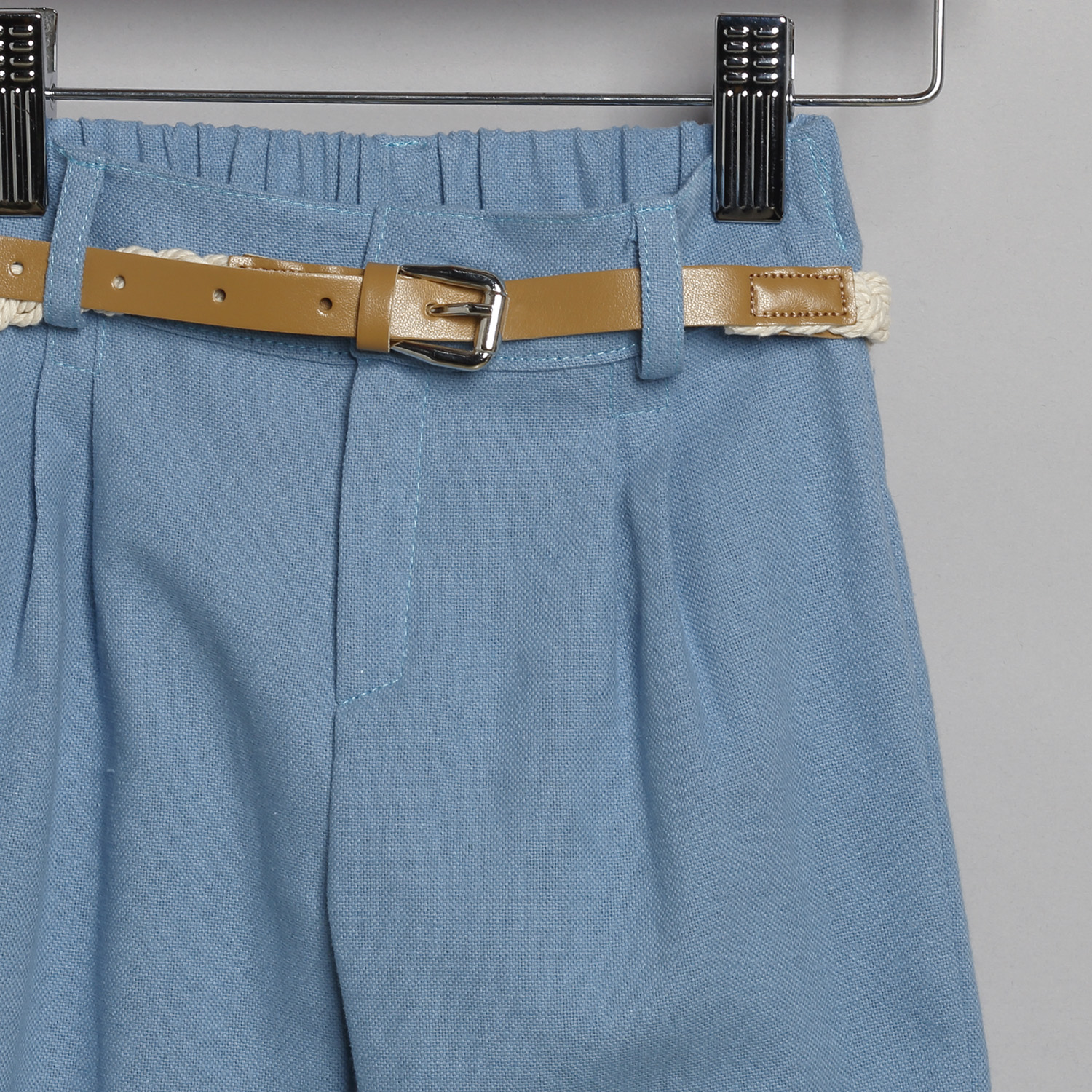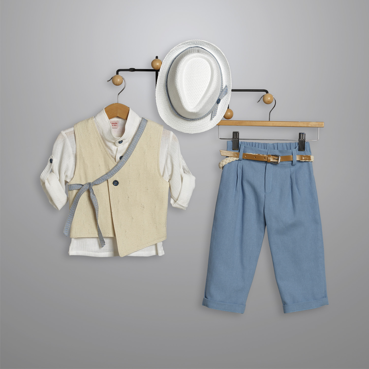 Σιέλ καμπαρντίνα παντελόνι, άσπρη βαμβακερή πουκαμίσα και μπεζ καμπαρντίνα καμβάς γιλέκο.Παντελόνι καμπαρντίνα σε σιέλ χρώμα. Εσωτερικά υπάρχει λάστιχο με κουμπότρυπα για τη ρύθμιση της μέσης. Διατίθεται επίσης σε μπεζ, βεραμάν και μπλε τζην χρώμα. Συνοδεύεται από σταθερή πλεκτή ζώνη. Πουκαμίσα βαμβακερή σε άσπρο χρώμα. Εσωτερικά του μανικιού υπάρχει θυλάκι, για να στερεώνεται το μανίκι όταν είναι σηκωμένο. Διατίθεται σε πολλά χρώματα. Γιλέκο καμβάς καμπαρντίνα σε μπεζ χρώμα.Το γιλέκο διατρέχει κορδέλα η οποία δένει με φιόγκο στο δεξί μέρος. Το σύνολο συνοδεύεται με ψάθινο άσπρο καβουράκι με κορδέλα ίδια με αυτή του γιλέκου.