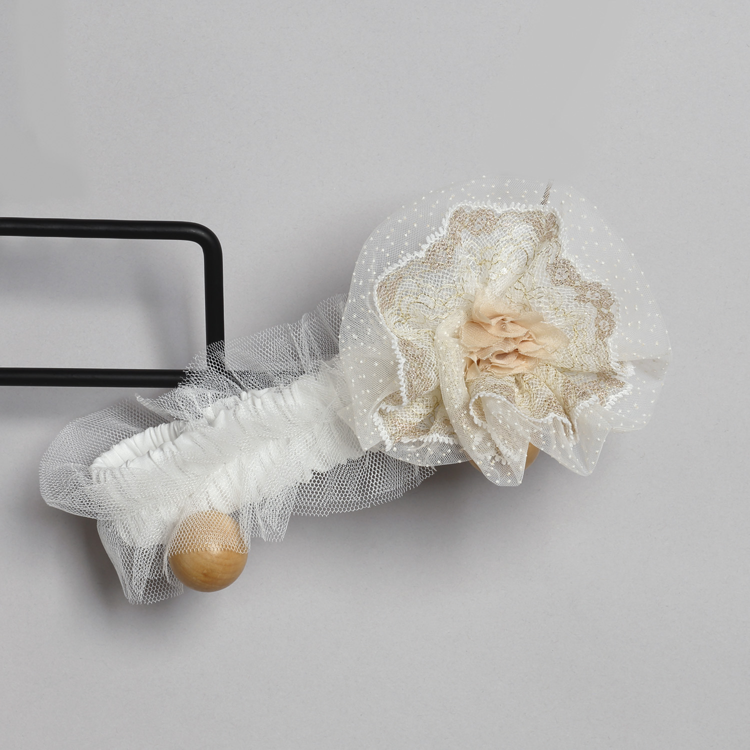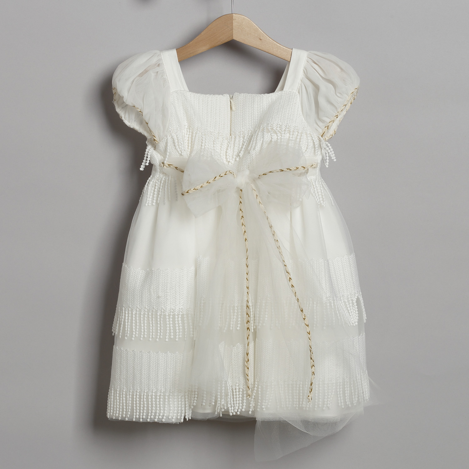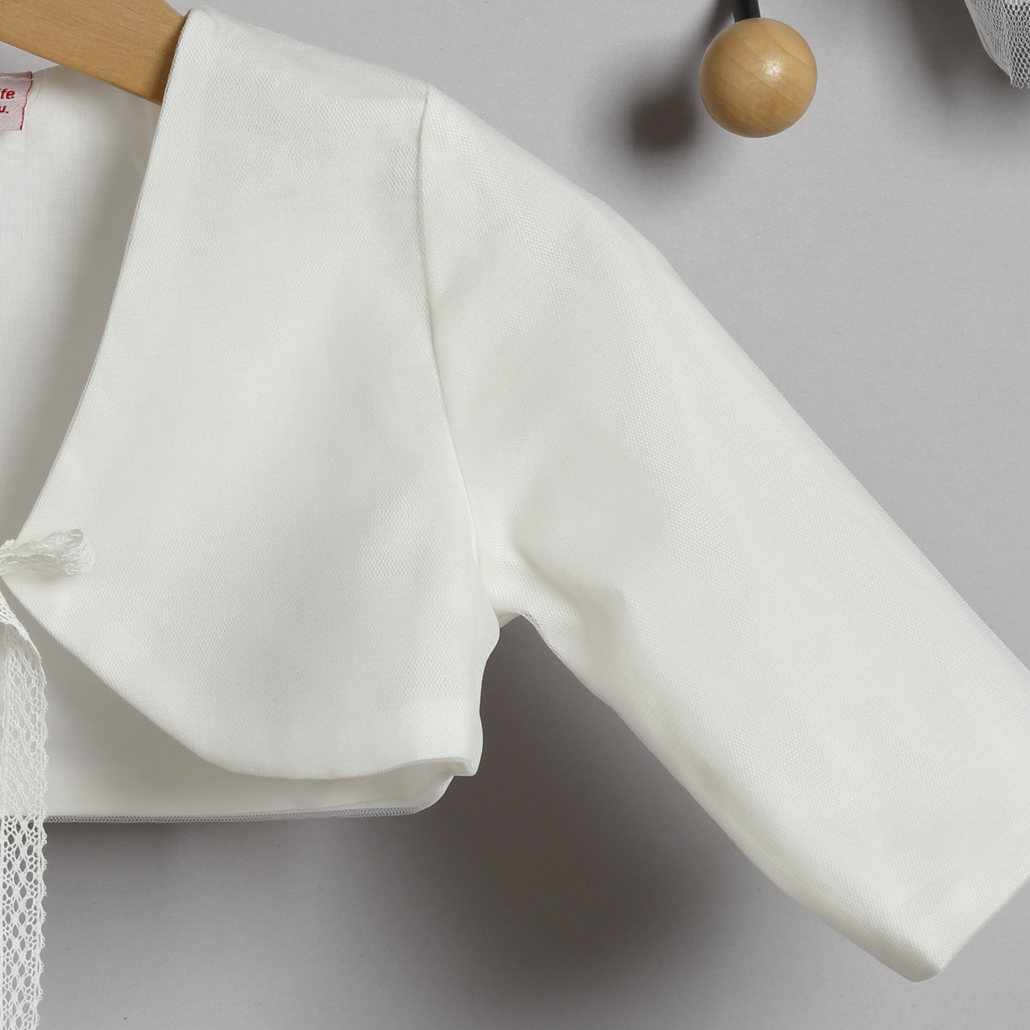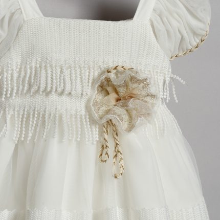 Φόρεμα από εκρού τούλι με κεντητά κρόσια στολισμένο με δαντελένιο λουλούδι.Φόρεμα από τούλι με κεντητά κρόσια σε εκρού χρώμα . Από μέσα υπάρχει δεύτερη φούστα από εκρού τούλι. Στο εσωτερικό του φορέματος υπάρχει βαμβακερή φόδρα. Ο στολισμός αποτελείται από ένα δαντελένιο λουλούδι ραμμένο πάνω σε ένα φιόγκο από κορδόνι. Στο πίσω μέρος υπάρχει μια ζώνη από τούλι κσι κορδόνι η οποία σχηματίζει φιόγκο στο πίσω μέρος. Η εσωτερική φούστα, η ζώνη και ο στολισμός διατίθενται σε πολλά χρώματα.Ζακετάκι σε εκρού χρώμα από τούλι, επενδυμένο με βαμβακερή φόδρα με δυο ραμμένα δαντελάκια που χρησιμοποιούνται για το δέσιμο. Κορδέλα από εκρού τούλι στολισμένη με δαντελένιο λουλούδι.