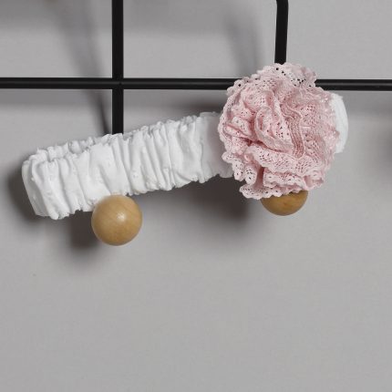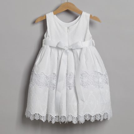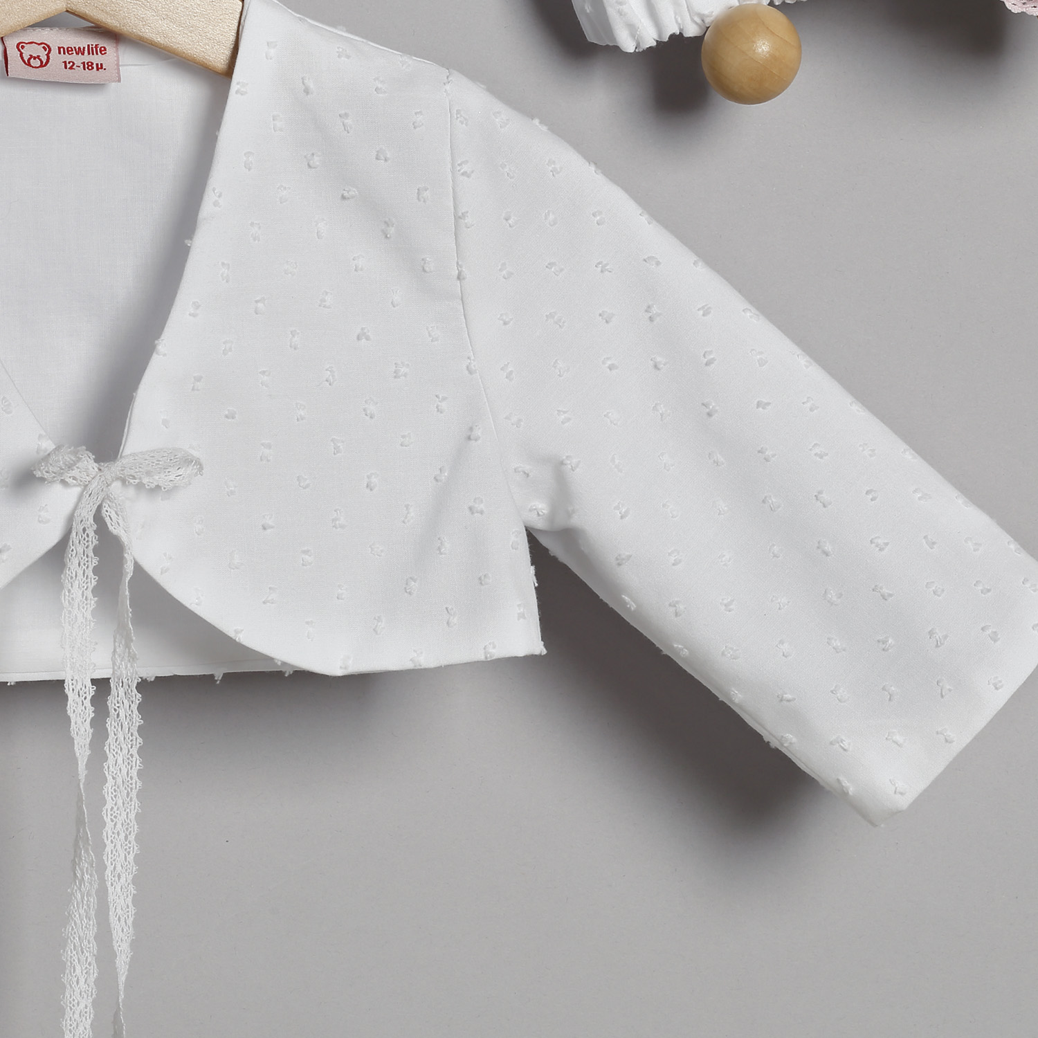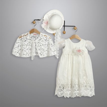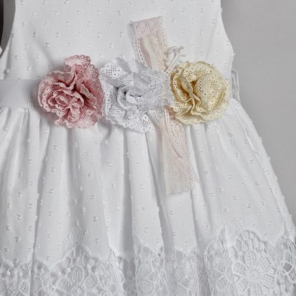 Φόρεμα από άσπρο μπροντερί στολισμένο με γκρο ζώνη και πλεκτά λουλούδια.Φόρεμα από μπροντερί σε άσπρο χρώμα από τούλι. Στο εσωτερικό του φορέματος υπάρχει διπλή βαμβακερή φόδρα. Ο στολισμός αποτελείται από μια γκρο κορδέλα ζώνη η οποία σχηματίζει φιόγκο στο πίσω μέρος. Μπροστά υπάρχουν τρία δαντελένια λουλούδια ραμμένα πάνω στη ζώνη μαζί με κρεμαστά δαντελάκια. Ο στολισμός διατίθεται σε πολλά χρώματα.Ζακετάκι από μπροντερί σε άσπρο χρώμα, επενδυμένο με βαμβακερή φόδρα με δυο κορδελάκια που χρησιμοποιούνται για το δέσιμο. Κορδέλα από άσπρο μπροντερί στολισμένη με δαντελένιο λουλούδι.
