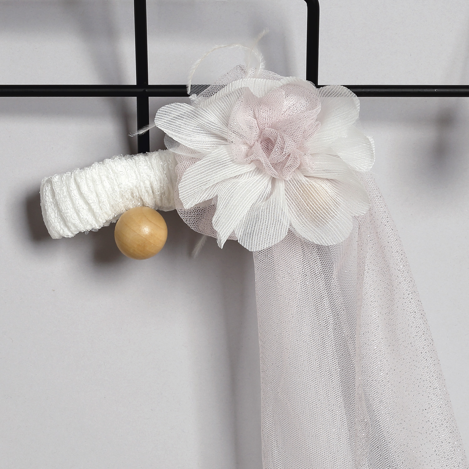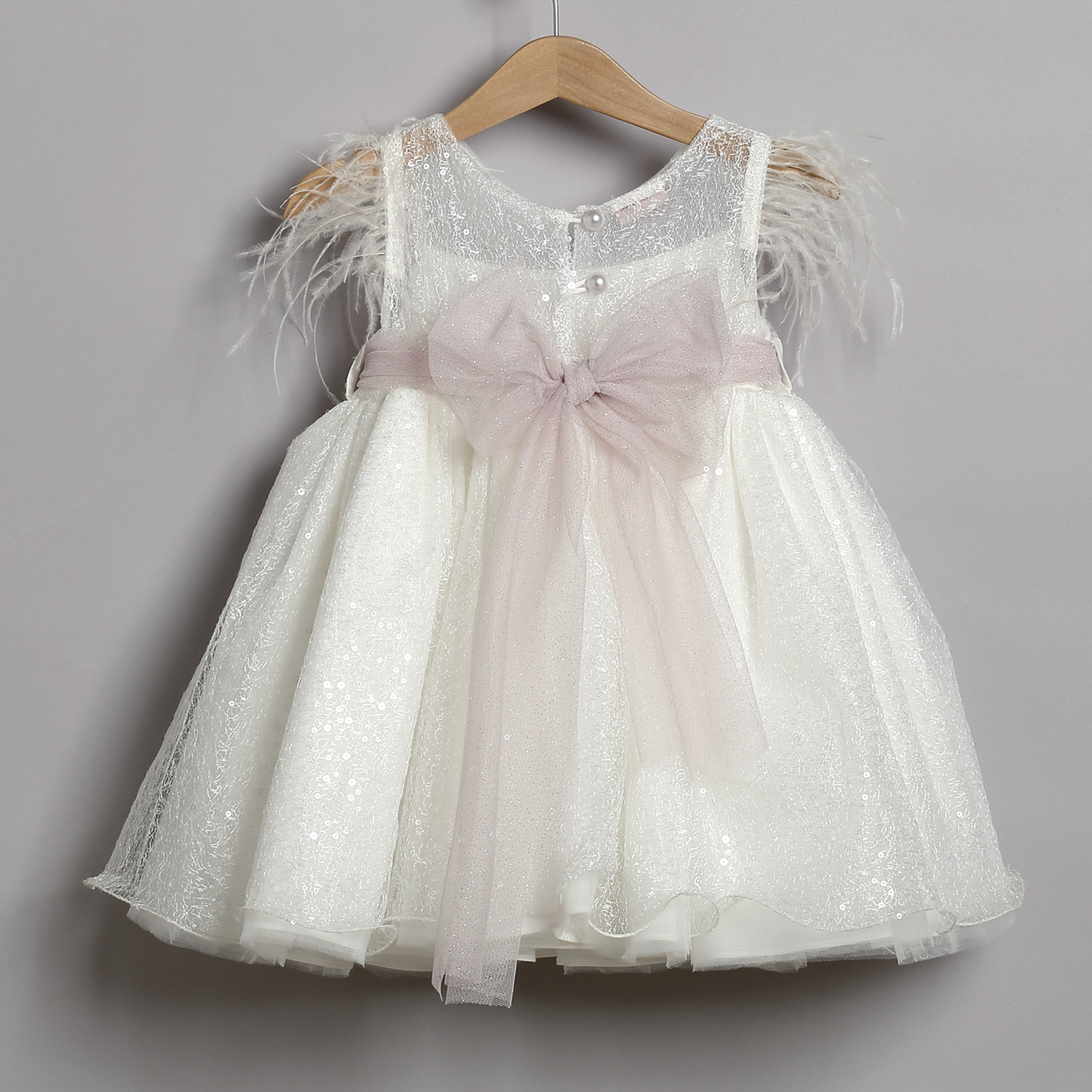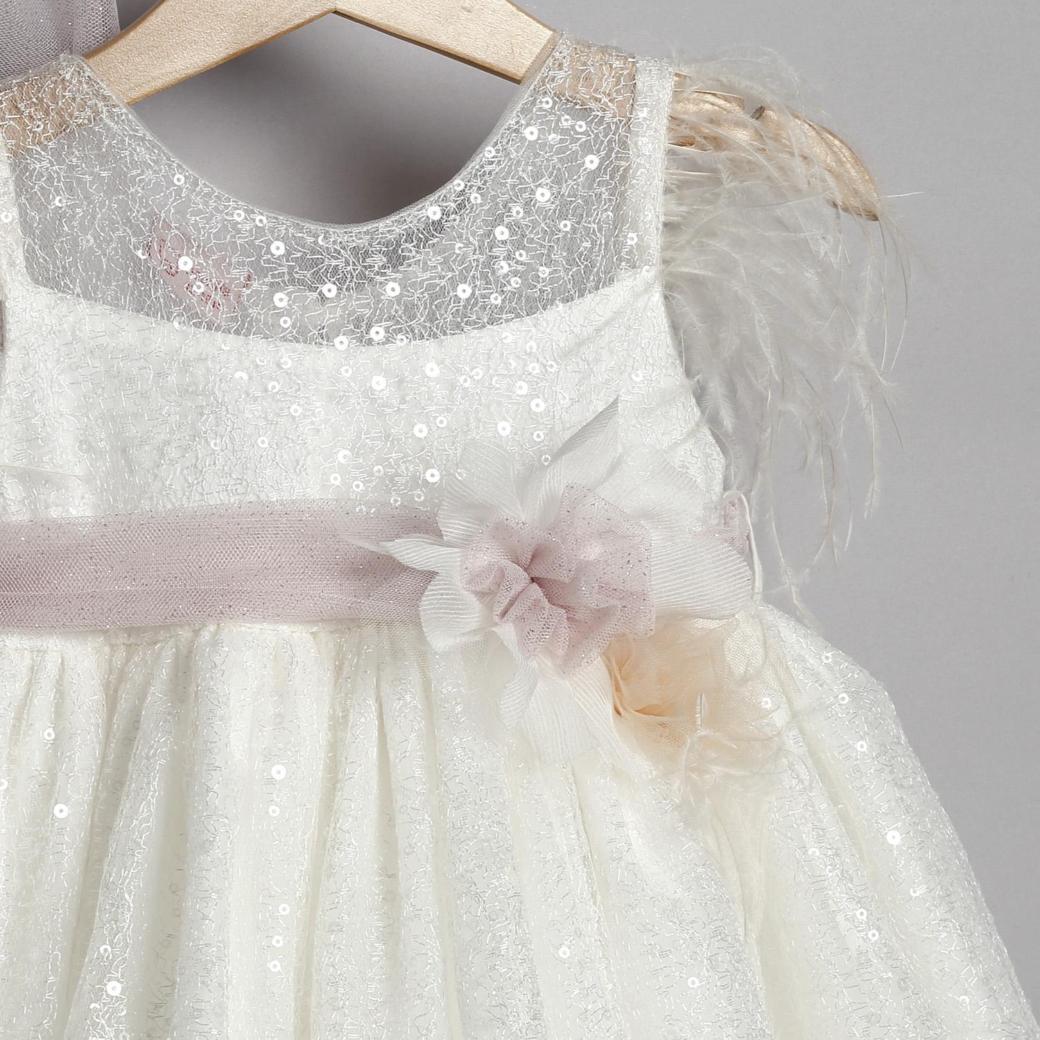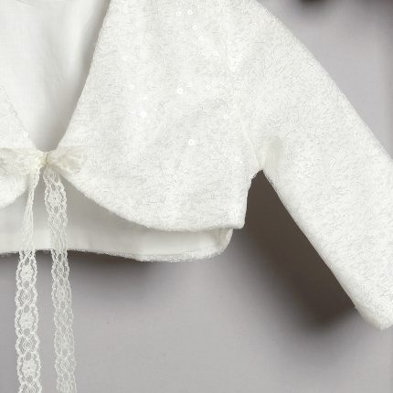 Φόρεμα από εκρού δαντέλα με παγέτες στολισμένο με τούλινη ζώνη, τούλινα λουλούδια και πούπουλα.Φόρεμα από δαντέλα με παγέτες σε εκρού χρώμα. Από μέσα υπάρχει δεύτερη φούστα από εκρού τούλι. Στο εσωτερικό του φορέματος υπάρχει βαμβακερή φόδρα. Ο στολισμός αποτελείται από μια ζώνη από γκλίτερ τούλι που σχηματίζει φιόγκο στο πίσω μέρος. Μπροστά υπάρχει ένα λουλούδι από τούλι και γκλίτερ τούλι. το οποίο είναι ραμμένο πάνω στη ζώνη. Ο στολισμός διατίθεται σε πολλά χρώματα. Ζακετάκι από δαντέλα με παγέτες σε εκρού χρώμα, επενδυμένο με βαμβακερή φόδρα με δυο δαντελάκια που χρησιμοποιούνται για το δέσιμο. Κορδέλα από εκρού δαντέλα με παγέτες στολισμένη με λουλούδι από γκλίτερ τούλι και τούλι.