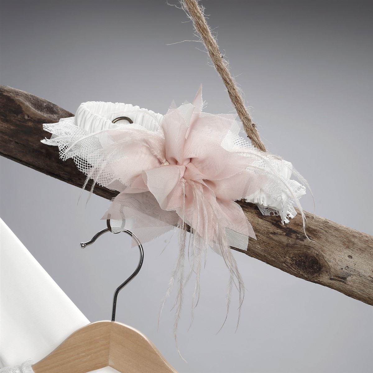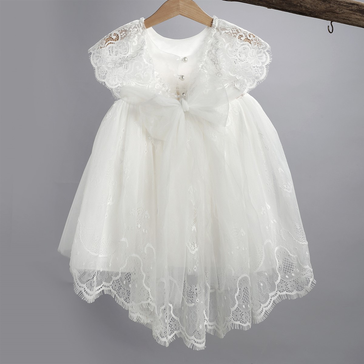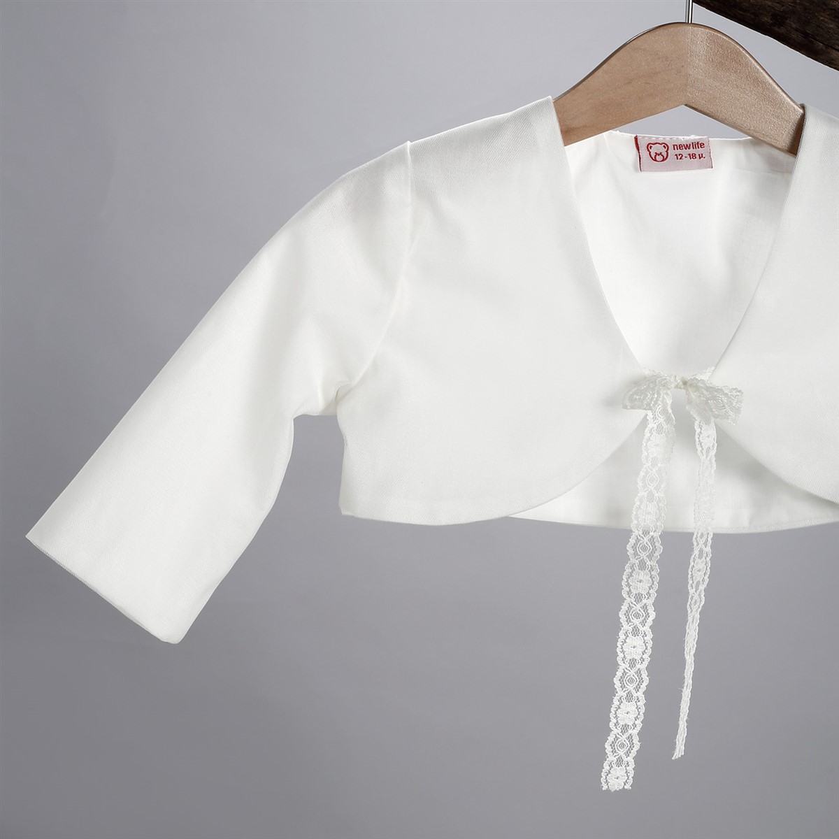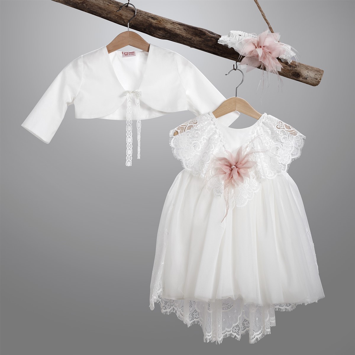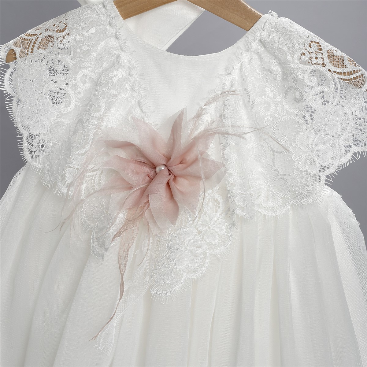 Εκρού φόρεμα από τούλι στολισμένο με λουλούδι και πούπουλα.Φόρεμα σε εκρού χρώμα από τούλι και δαντέλα. Στο εσωτερικό του φορέματος υπάρχει διπλή βαμβακερή φόδρα. Ο στολισμός αποτελείται από μια τούλινη ζώνη η οποία σχηματίζει φιόγκο στο πίσω μέρος. Μπροστά υπάρχει ένα λουλούδι από μουσελίνα το οποίο είναι ραμμένο πάνω σε πούπουλα. Το φόρεμα διατίθεται επίσης σε άσπρο, ροζ, μπεζ, σωμόν και σάπιο μήλο χρώμα. Ο στολισμός διατίθεται σε πολλά χρώματα. Ζακετάκι σε εκρού χρώμα από τούλι, επενδυμένο με βαμβακερή φόδρα με δυο κορδελάκια που χρησιμοποιούνται για το δέσιμο. Διατίθεται επίσης σε άσπρο, ροζ, μπεζ, σωμόν και σάπιο μήλο χρώμα. Κορδέλα από εκρού δαντέλα στολισμένη με λουλούδι από μουσελίνα.