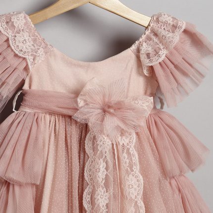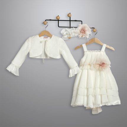 Φόρεμα από σάπιο μήλο πουά τούλι στολισμένο με τούλινη ζώνη, λουλούδι και δαντελάκια.Φόρεμα από πουά τούλι σε σάπιο μήλο χρώμα. Στο εσωτερικό του φορέματος υπάρχει βαμβακερή φόδρα. Ο στολισμός αποτελείται από μια τούλινη ζώνη η οποία σχηματίζει φιόγκο στο πίσω μέρος. Μπροστά υπάρχει ένα λουλούδι από πλισέ τούλι και τούλι, με μια πέρλα στο εσωτερικό του, το οποίο είναι ραμμένο πάνω στη ζώνη μαζί με κρεμαστά δαντελάκια. Το φόρεμα διατίθεται επίσης σε άσπρο, εκρού, μπεζ, ροζ και σωμόν χρώμα. Ο στολισμός διατίθεται σε πολλά χρώματα. Ζακετάκι από πουά τούλι σε σάπιο μήλο χρώμα, επενδυμένο με βαμβακερή φόδρα με ένα κουμπί πέρλα που χρησιμοποιείται για το κλείσιμο. Διατίθεται επίσης σε άσπρο, εκρού, μπεζ, ροζ και σωμόν χρώμα. Κορδέλα από σάπιο μήλο τούλι στολισμένη με λουλούδι από πλισέ τούλι.