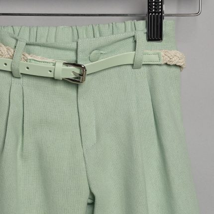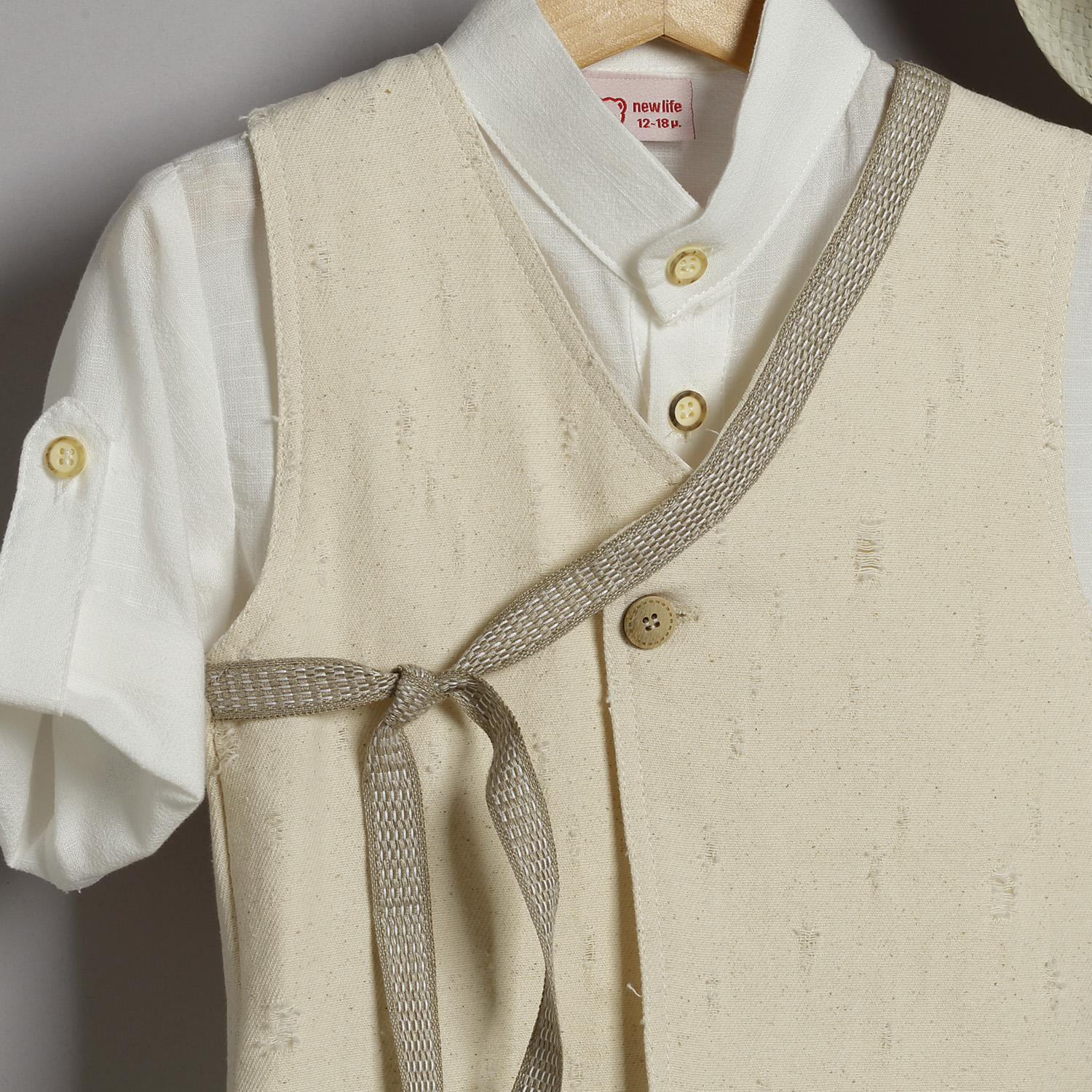 Βεραμάν καμπαρντίνα παντελόνι, εκρού βαμβακερή πουκαμίσα και μπεζ καμπαρντίνα καμβάς γιλέκο.Παντελόνι καμπαρντίνα σε βεραμάν χρώμα. Εσωτερικά υπάρχει λάστιχο με κουμπότρυπα για τη ρύθμιση της μέσης. Διατίθεται επίσης σε μπεζ, σιέλ και μπλε τζην χρώμα. Συνοδεύεται από σταθερή πλεκτή ζώνη. Πουκαμίσα βαμβακερή σε εκρού χρώμα. Εσωτερικά του μανικιού υπάρχει θυλάκι, για να στερεώνεται το μανίκι όταν είναι σηκωμένο. Διατίθεται σε πολλά χρώματα. Γιλέκο καμβάς καμπαρντίνα σε μπεζ χρώμα.Το γιλέκο διατρέχει κορδέλα η οποία δένει με φιόγκο στο δεξί μέρος. Το σύνολο συνοδεύεται με ψάθινο εκρού καβουράκι με κορδέλα ίδια με αυτή του γιλέκου.