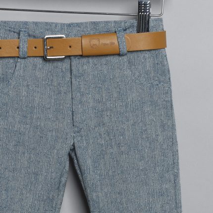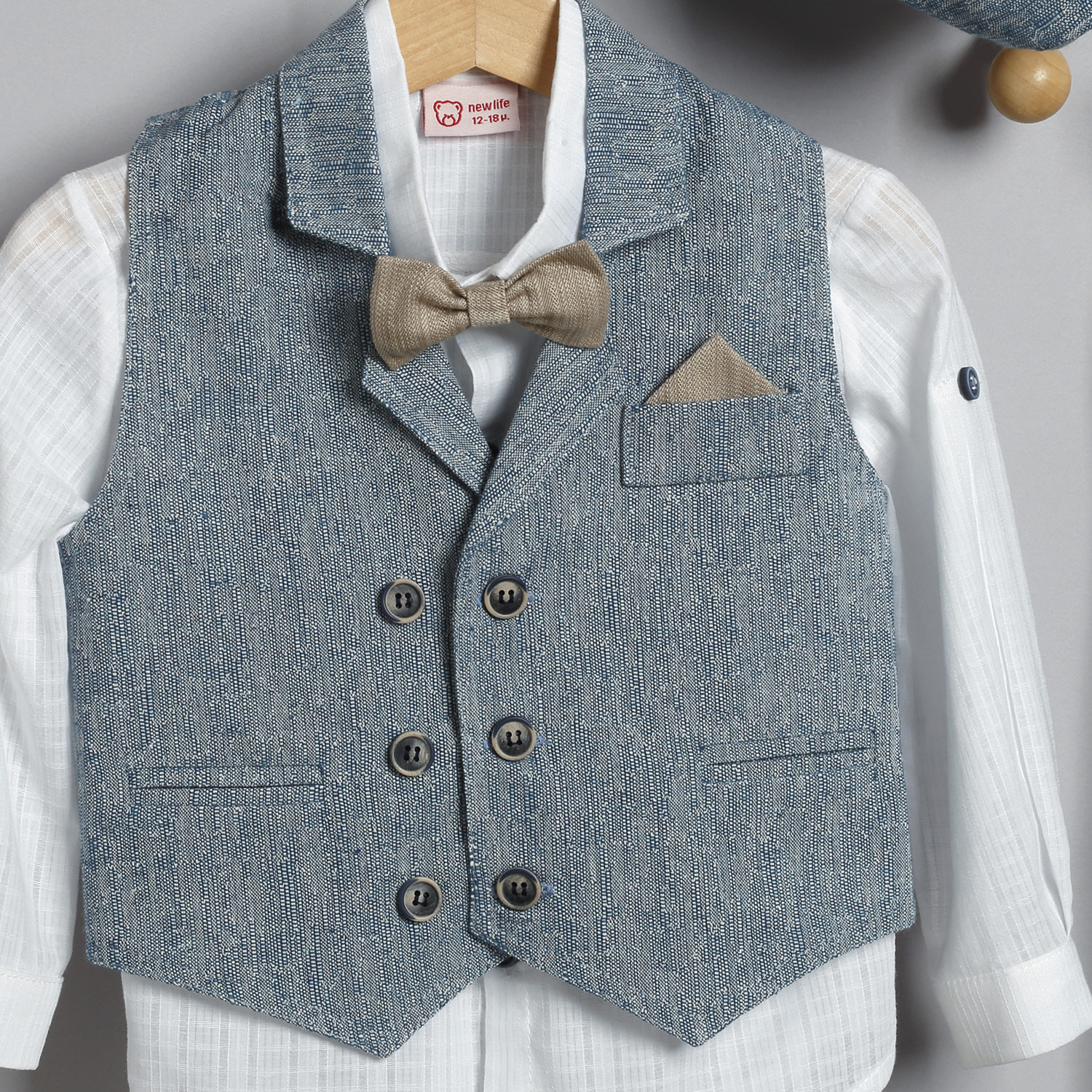 Μπλε λινό ψάθα παντελόνι, άσπρο βαμβακερό πουκάμισο και μπλε λινό ψάθα γιλέκο.Παντελόνι λινό ψάθα σε μπλε χρώμα. Εσωτερικά υπάρχει λάστιχο με κουμπότρυπα για τη ρύθμιση της μέσης. Διατίθεται επίσης σε μπεζ και σιέλ χρώμα. Συνοδεύεται από σταθερή δερμάτινη ζώνη. Πουκάμισο βαμβακερό άσπρο μονόχρωμο. Εσωτερικά του μανικιού υπάρχει θυλάκι, για να στερεώνεται το μανίκι όταν είναι σηκωμένο. Διατίθεται σε πολλά χρώματα. Γιλέκο λινό ψάθα σε μπλε χρώμα, με δυο κρυφά τσεπάκια στα πλαινά και ένα στο πέτο με μαντηλάκι. Διατίθεται επίσης σε μπεζ και σιέλ χρώμα. Το σύνολο συνοδεύεται από υφασμάτινο παπιόν και τραγιάσκα από το ύφασμα του παντελονιού.