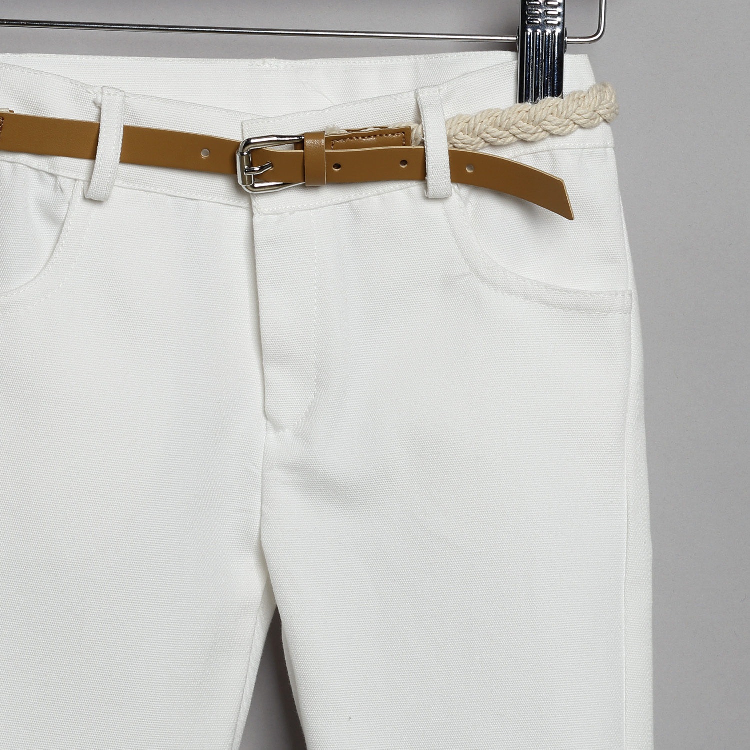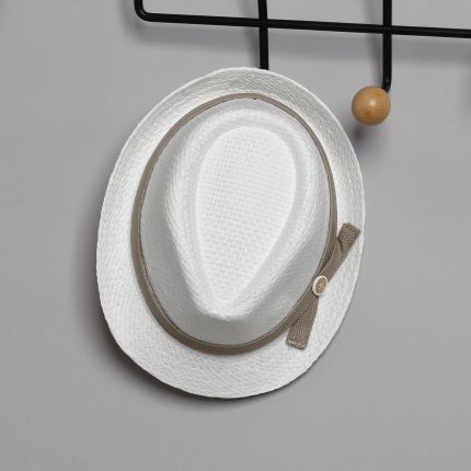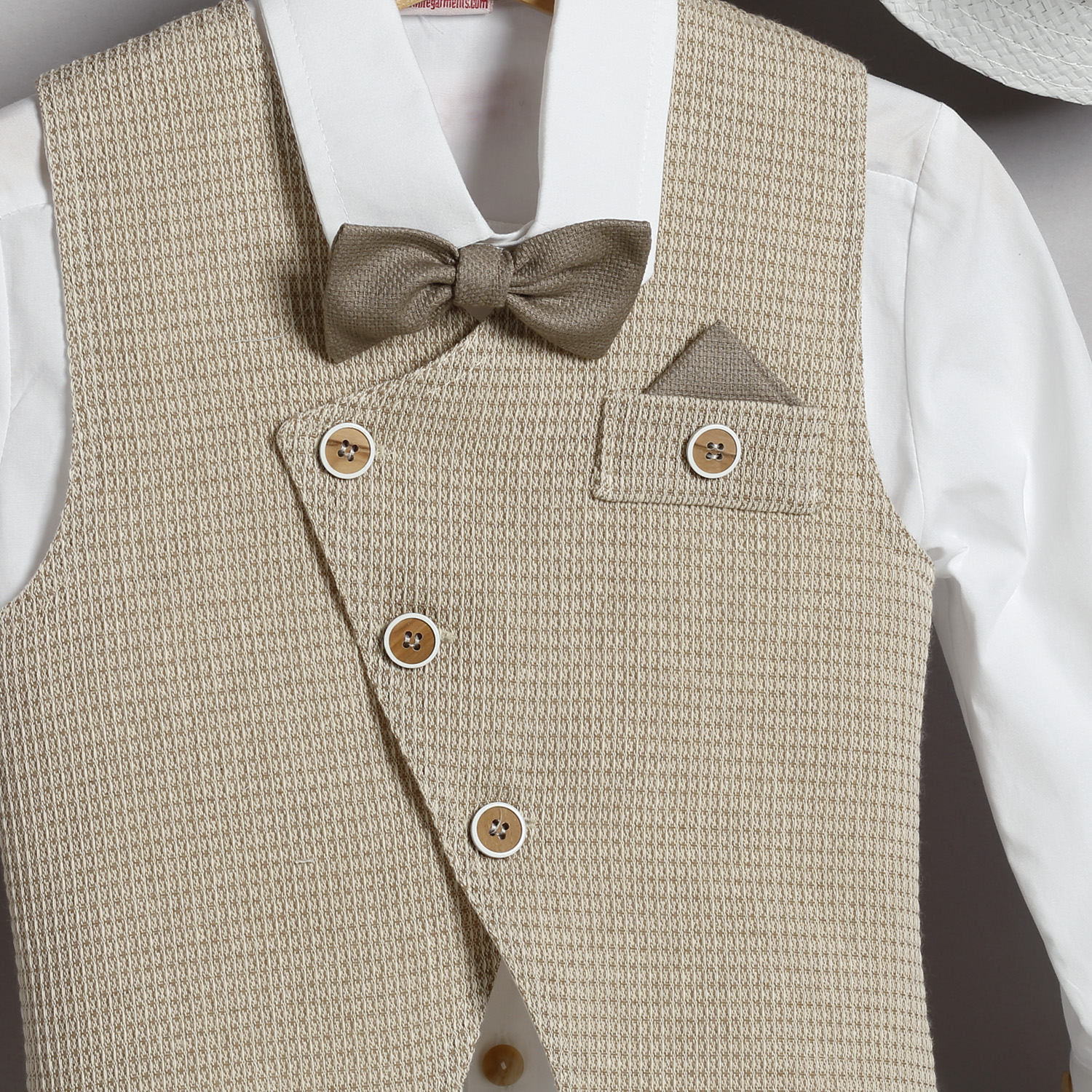 Άσπρο καμπαρντίνα παντελόνι, άσπρο βαμβακερό πουκάμισο και μπεζ ψάθα γιλέκο.Παντελόνι καμπαρντίνα σε άσπρο χρώμα. Εσωτερικά υπάρχει λάστιχο με κουμπότρυπα για τη ρύθμιση της μέσης. Διατίθεται επίσης σε μπεζ, βεραμάν, λαδί, σιέλ και μπλε χρώμα. Συνοδεύεται από σταθερή πλεκτή ζώνη. Πουκάμισο βαμβακερό άσπρο μονόχρωμο. Εσωτερικά του μανικιού υπάρχει θυλάκι, για να στερεώνεται το μανίκι όταν είναι σηκωμένο. Διατίθεται σε πολλά χρώματα. Γιλέκο ψάθα σε μπεζ χρώμα, με ένα τσεπάκι στο πέτο με μαντηλάκι. Διατίθεται επίσης σε σιέλ και μπλε χρώμα. Το σύνολο συνοδεύεται με υφασμάτινο παπιόν και ψάθινο άσπρο καβουράκι με κορδέλα από το ύφασμα του παπιόν.