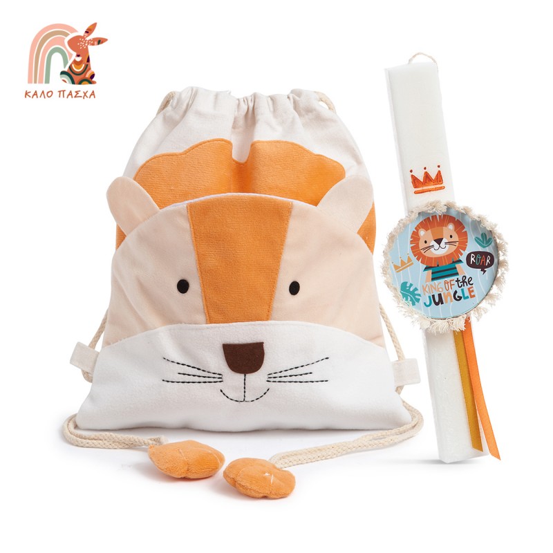 Πασχαλινό σετ δώρου. Περιλαμβάνει: 1) το υφασμάτινο backpack με σχέδιο λιονταράκι 2) τη λαμπάδα διακοσμημένη με στρογγυλή παράσταση king of the jungle και ζωγραφιστή κορώνα στο κερί